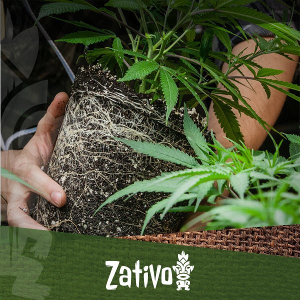 Ricordandosi ciò, l'obiettivo rimane quello di far crescere grandi radici soffici, di un bianco luminoso, in grado di svilupparsi ulteriormente una volta sistemate adeguatamente in un nuovo vaso o su un nuovo terreno. Quando le piante sono piccole, l'obiettivo deve essere quello di coltivarle in fase iniziale all'interno di piccoli vasi da 2 litri, per terminare il ciclo colturale in un vaso da 15 litri. Una volta che la piantina è sbucata e si sono formate i primi quattro giri di foglioline, controllate le radici capovolgendo il vaso a testa in giù, afferrando il fusto della pianta con le dita. Dovete controllare che le radici siano completamente coperte dal terriccio. Le radici devono apparire di un bianco luminoso e a forma di lisca di pesce. Le radici, inoltre, possono talvolta apparire irsute e pelose e, spesso, possono risultare sovrapposte fra loro. A questo punto le piante andrebbero trapiantate e poste in un vaso da 6,5 litri, ad esempio, e lasciate vegetare ulteriormente. A questo stadio, la pianta potrà crescere bene fino alla formazione del settimo livello di foglie. Molti coltivatori, a questo punto, avranno già in mente il substrato finale per le proprie piante, quello della fioritura, che sarà ricco di Potassio e Fosforo. Per chi coltiva le piante all'aperto è utile sapere che, trapiantandole dal vaso da 2 litri, con le radici in condizioni ottimali, potranno raggiungere dimensioni maggiori grazie alla possibilità che l'apparato radicale ha di ottenere nuove sostanze nutrienti dal terreno.